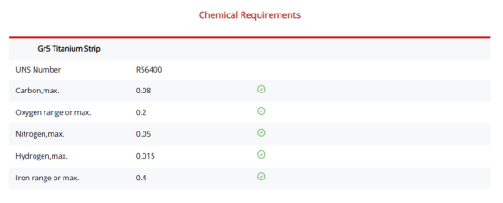 Fait de confiance dans les applications de l’aérospatiale aux dispositifs médicaux, notre bande de titane Gr5 répond aux exigences rigoureuses des normes ASME SB 265, AMS 4905, AMS 4911 et DMS 1592.